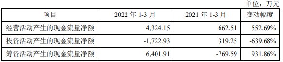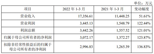 2022年1-3月,公司实现营业收入17,356.61万元,同比增长51.61%;归属于母公司所有者的净利润为3,072.17万元,同比增长123.87%;经营活动产生的现金流量净额为4,324.15万元,同比增长552.69%。